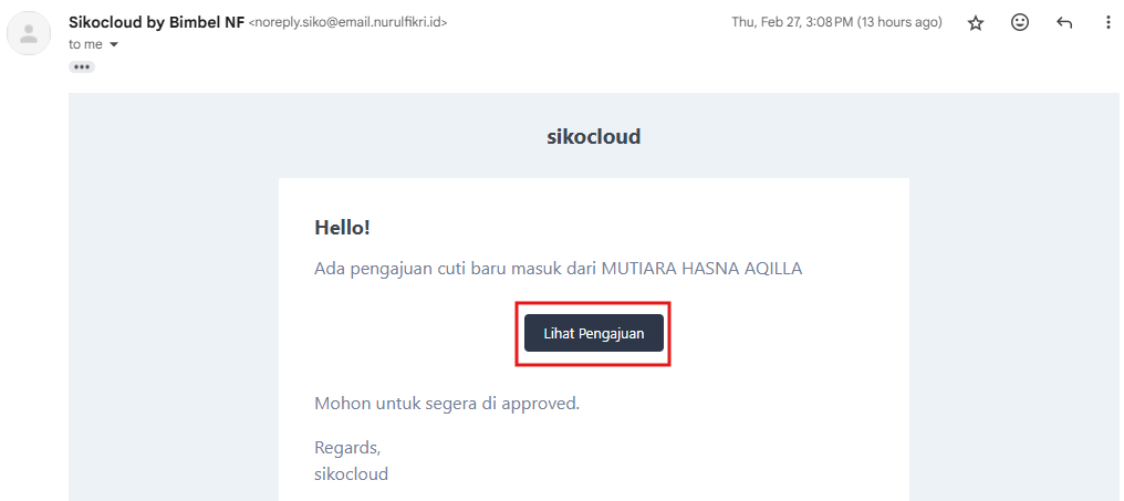 Manajer Melihat Notifikasi Pengajuan Cuti Pegawai Melalui Email
