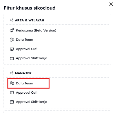 2. Pada dropdown "Fitur Khusus SIKOCLOUD", pilih role "Manajer", lalu klik menu "Data Team".