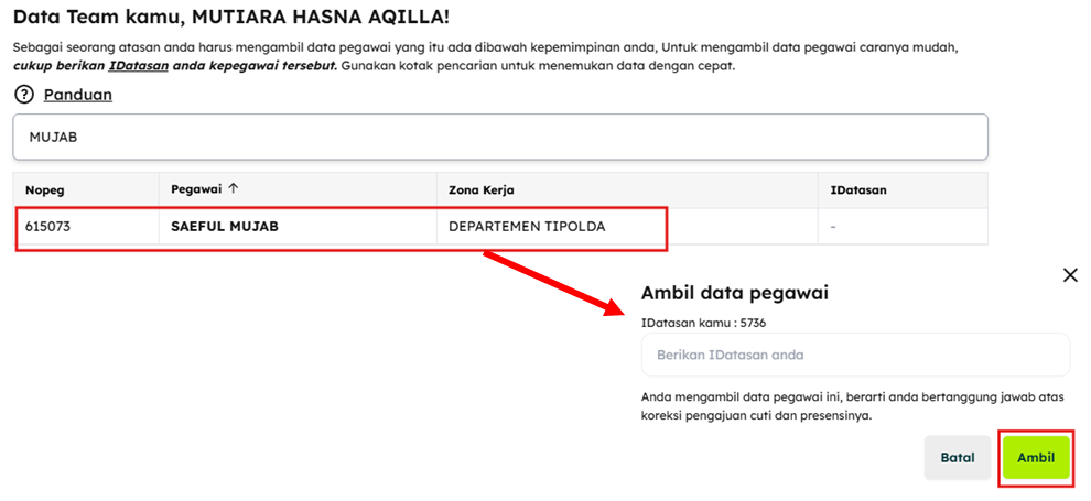 4. Klik nama anggota, lalu isilah idatasan anda pada popup "Ambil Data Pegawai". Setelah terisi, klik "Ambil".
