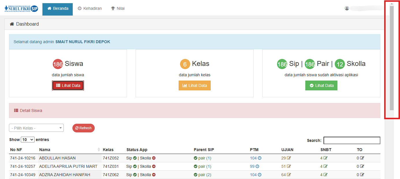 Untuk mengakses dashboard SIS, silahkan kunjungi di : https://sip.nurulfikri.co/sekolah/