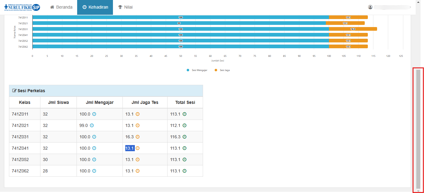 Tabel memberikan detail jumlah siswa, sesi mengajar, menjaga tes, dan total sesi di setiap kelas.