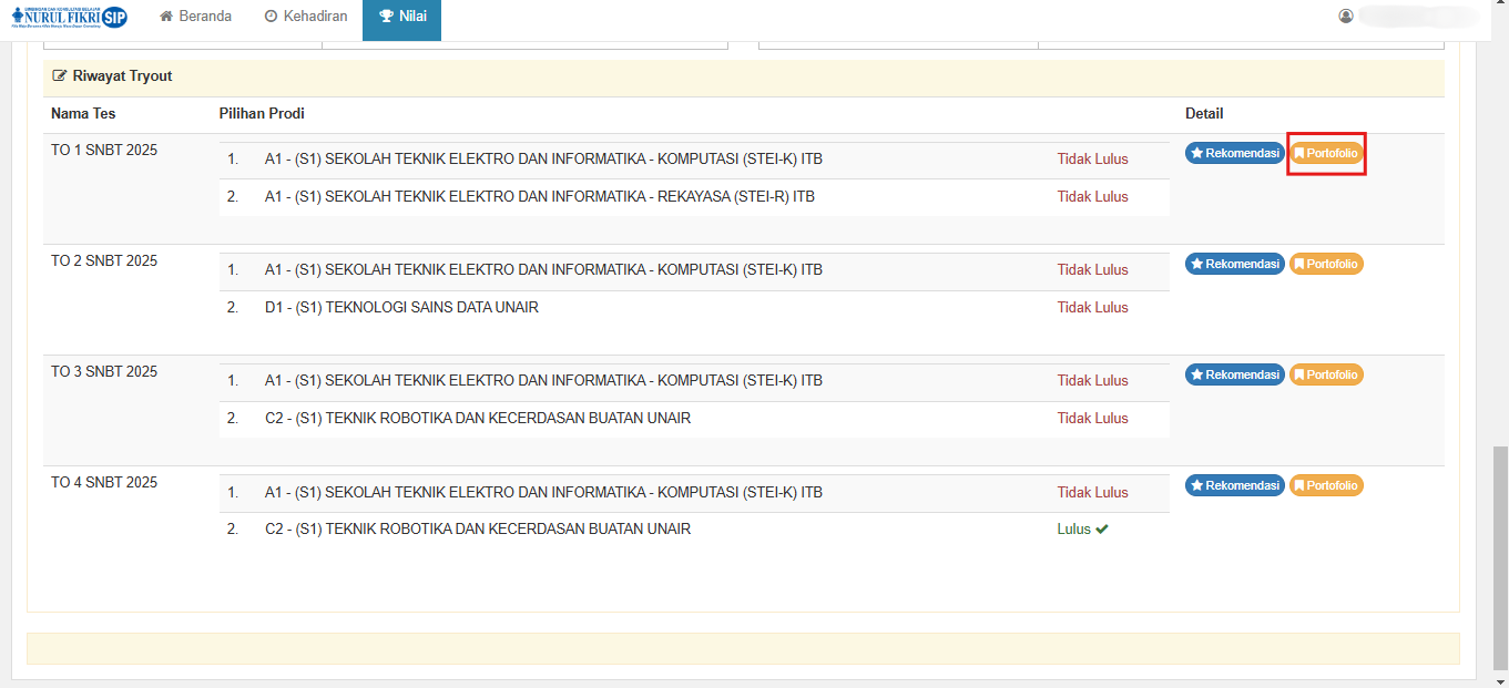 1. Masih di halaman nilai SNBT, Anda dapat melihat portfolio yang memuat bukti hasil pengerjaan try out