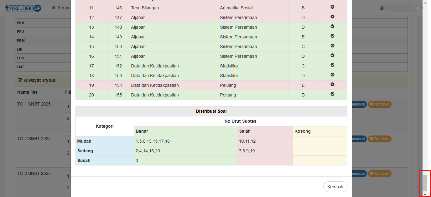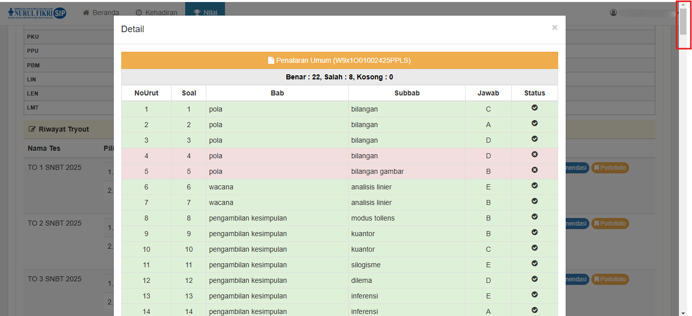 Misalnya, untuk panduan kali ini, kita akan melihat nilai dan jumlah pertanyaan yang berhasil dijawab oleh siswa pada "TO 1 SNBT 2025"