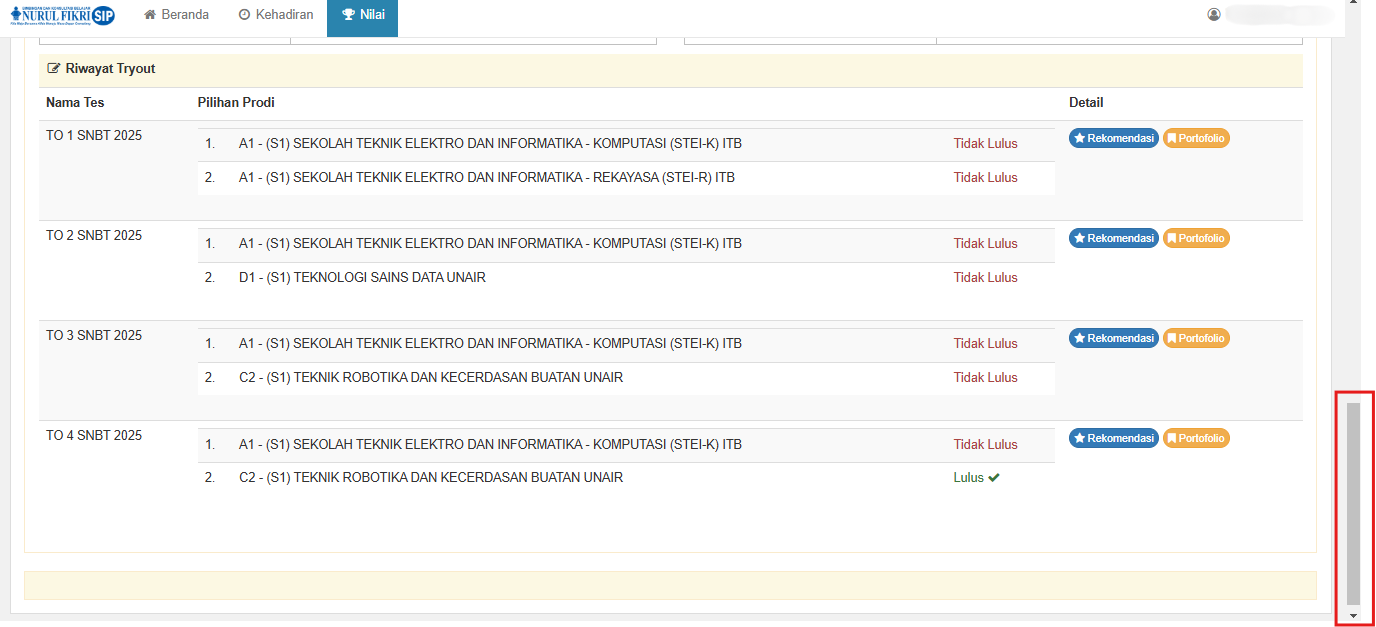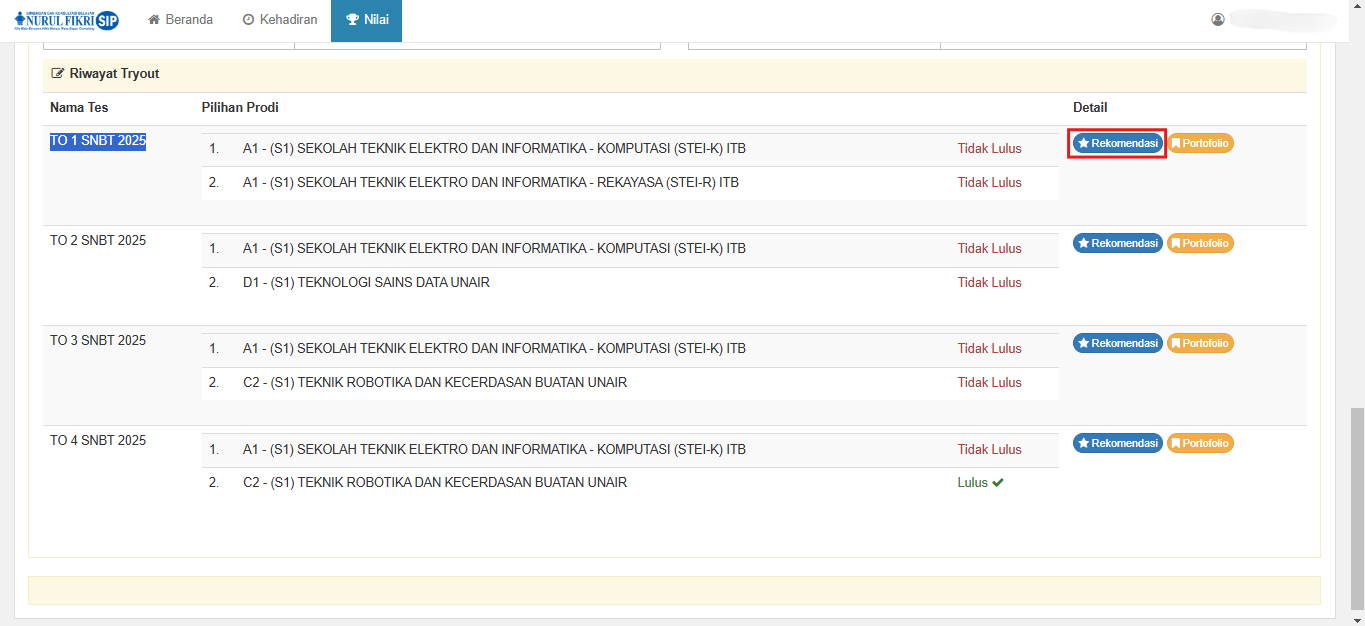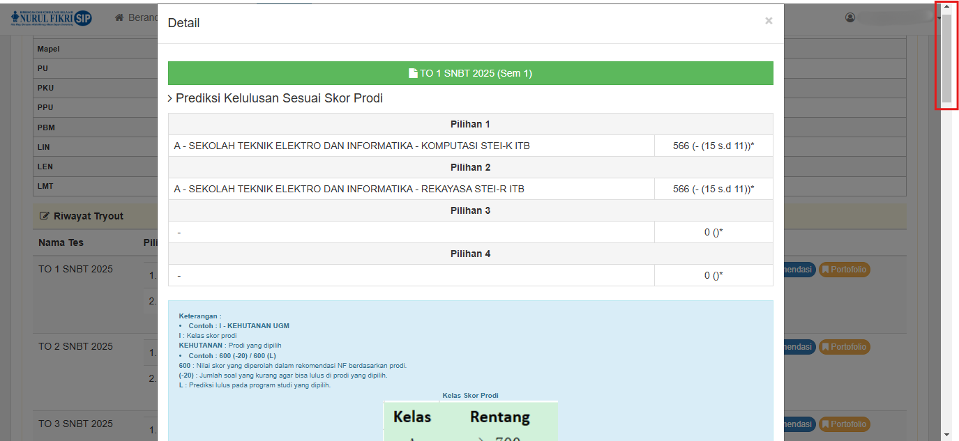 1. Masih di halaman nilai SNBT, Anda dapat melihat rekomendasi program studi siswa berdasarkan skor ujian yang ia dapatkan.