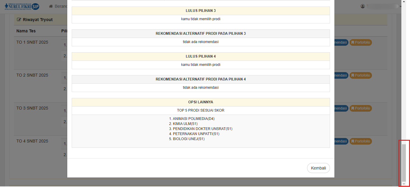 5. Tekan tombol "KEMBALI" untuk kembali ke halaman riwayat try out.