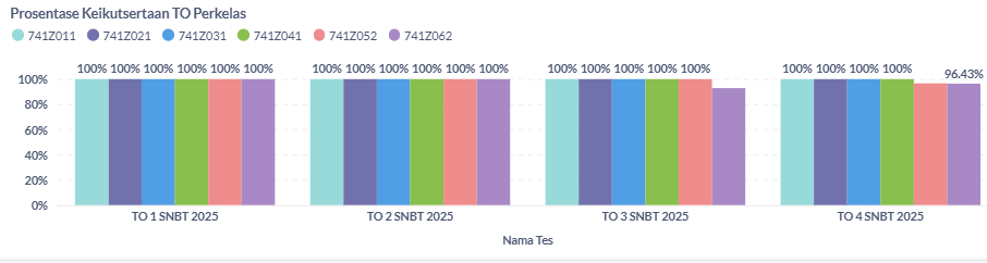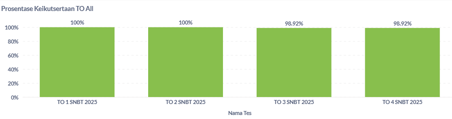 Dari grafik di atas dapat disimpulkan bahwa pada sesi TO 1 SNBT 2025 dan TO 2 SNBT 2025, keikutsertaan siswa mencapai 100%. Sementara itu, pada TO 3 SNBT 2025 dan TO 4 SNBT 2025, keikutsertaan siswa menurun menjadi 98,92%.