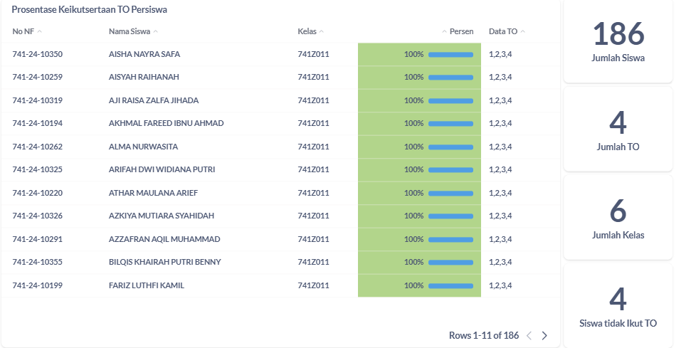 • Menunjukkan presentase keikutsertaan siswa pada setiap sesi try out dalam rentang 0% hingga 100%.