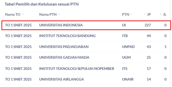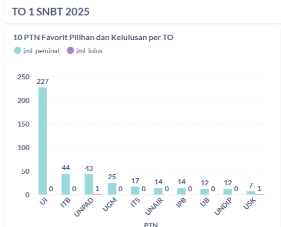 Dari grafik dan tabel di atas dapat disimpulkan bahwa Universitas Indonesia adalah perguruan tinggi negeri paling favorit dengan 227 peminat, namun tidak ada siswa yang diterima di Universitas Indonesia (terlihat pada semua bilah ungu yang menunjukkan nilai 0).