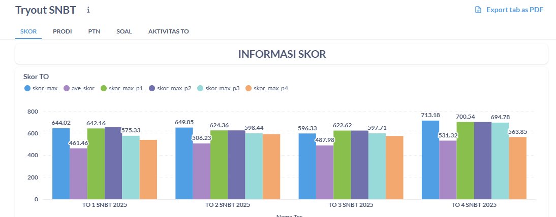 Dari grafik di atas dapat disimpulkan bahwa skor maksimum tertinggi tercatat pada TO 4 SNBT 2025 sebesar 713,18 dan rata-rata skor tertinggi sebesar 531,32.