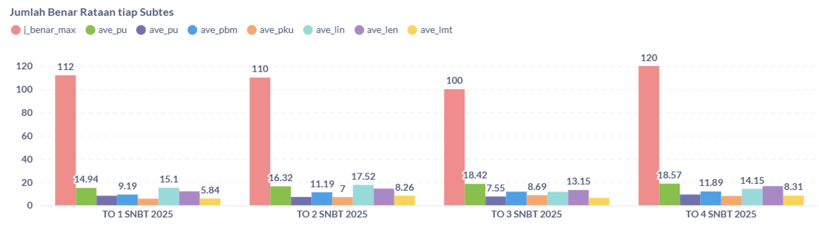 Dari grafik di atas dapat disimpulkan bahwa rata-rata per sesi (j_benar_max) mencapai nilai tertinggi sebesar 120 pada TO 4 SNBT 2025, sedangkan rata-rata subtes lainnya seperti pada "PENGETAHUAN UMUM" (ave_pu) tertinggi di 18.57 dan "PENALARAN BERBASIS MATEMATIKA" (ave_pbm) terendah di 5.84 pada TO 1 SNBT 2025.