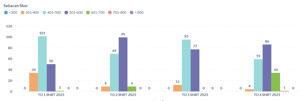 Dari grafik di atas dapat disimpulkan bahwa pada TO 1 SNBT 2025 memiliki jumlah peserta terbanyak, yaitu terdapat pada kategori skor antara 501-600, dengan 101 peserta. Sementara itu, 34 peserta berada pada kategori skor 301-400."