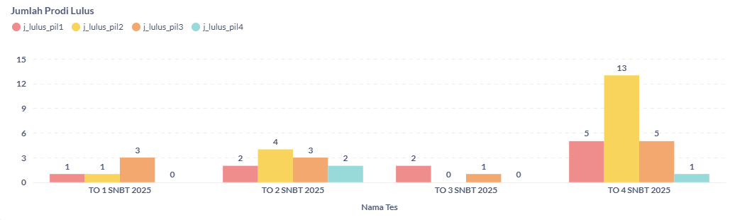 Dari grafik di atas dapat disimpulkan bahwa jumlah prodi lulus siswa tertinggi terjadi pada TO 4 SNBT 2025 dengan 13 siswa lulus pada program studi pilihan 2, sedangkan kelulusan pada pilihan lainnya lebih rendah, yaitu 1 siswa lulus pada program studi pilihan 4,
