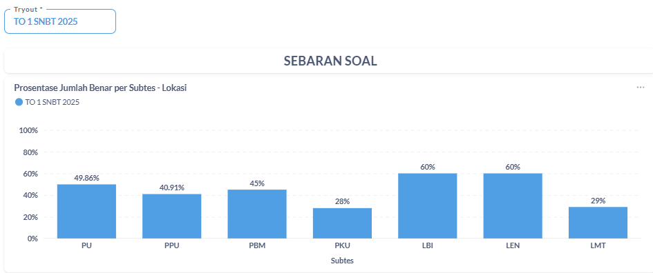 - LOKASI (Biru): Presentase jawaban benar siswa pada setiap sesi TO SNBT 2025 berdasarkan secara keseluruhan.