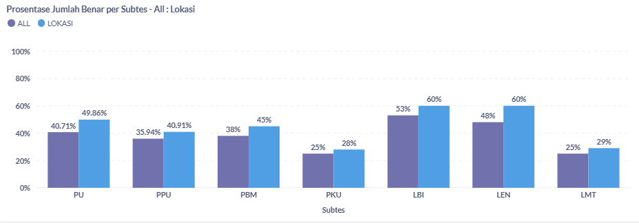 Dari grafik di atas dapat disimpulkan bahwa subtes "LBI dan LEN" memiliki presentase jawaban benar tertinggi sebesar 60% pada kategori LOKASI dan ALL. sedangkan subtes "PKU" dan "LMT" memiliki presentase jawaban benar terendah sebesar 28% dan 29% pada LOKASI serta 25% pada ALL.