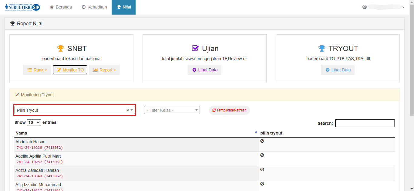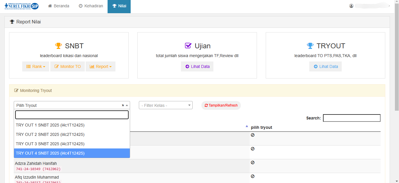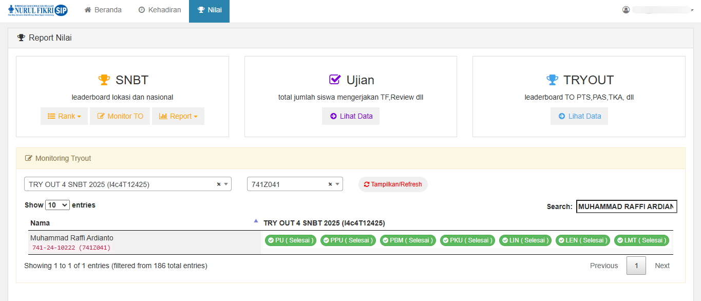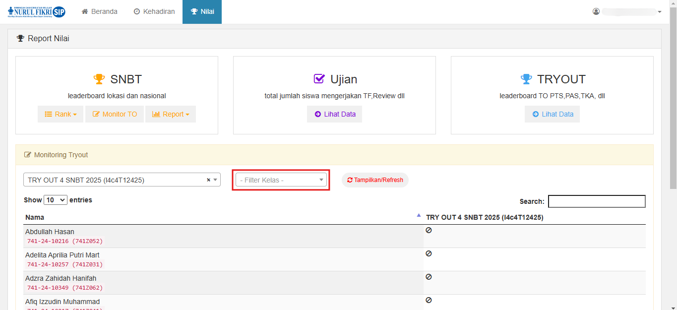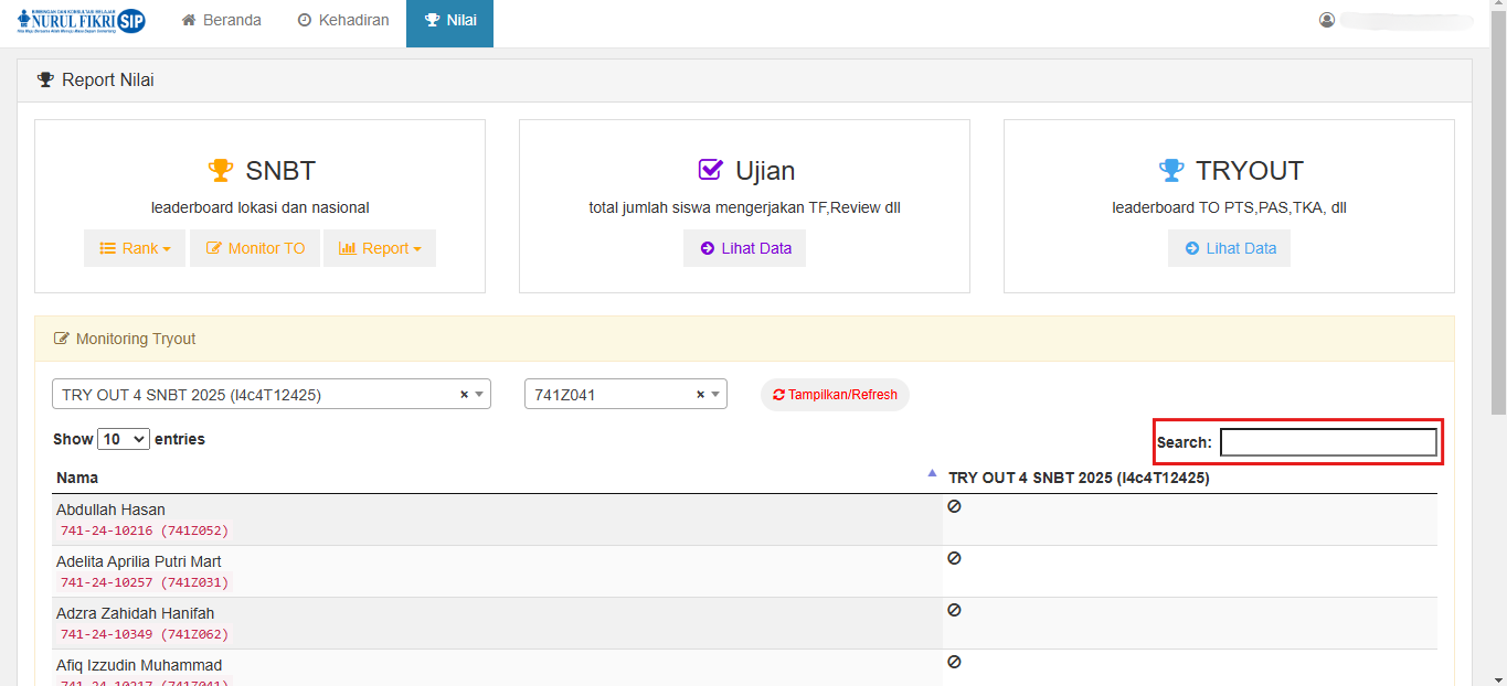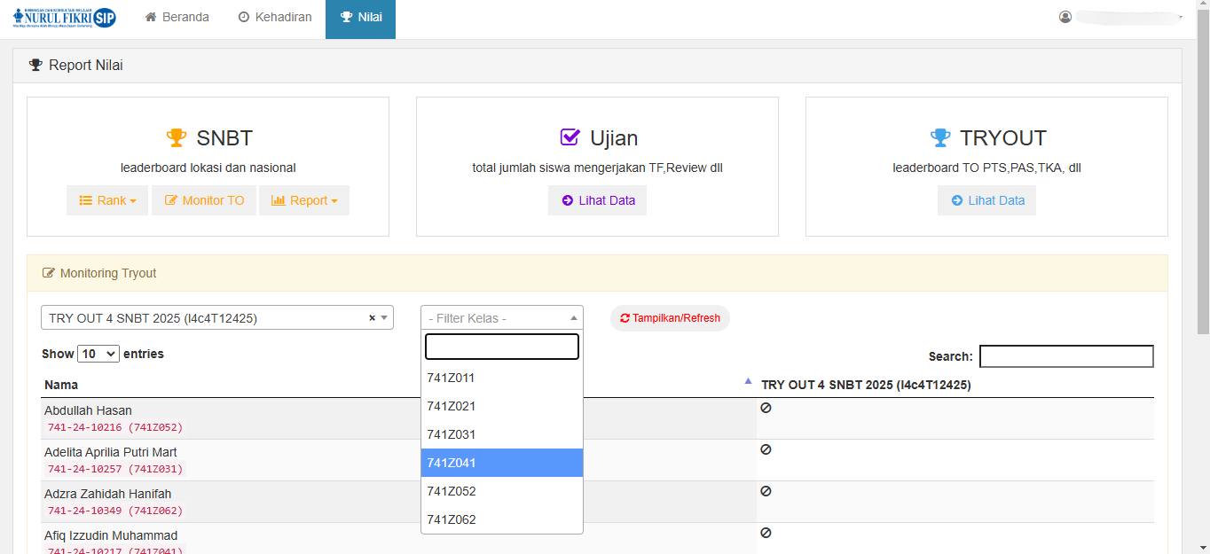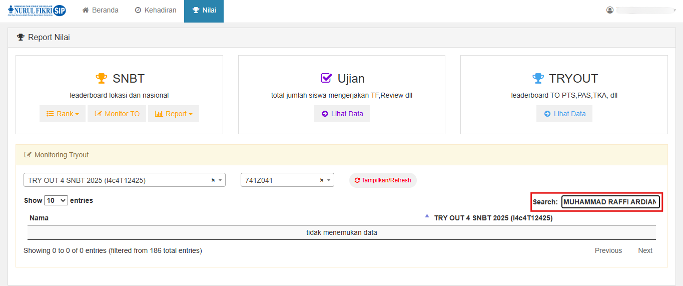 Misalnya, untuk panduan kali ini, kita akan mencari siswa yang bernama MUHAMMAD RAFFI ARDIANTO dari kelas 741Z041, apakah ia sudah mengerjakan tes TRY OUT 4 SNBT 2025 atau belum.