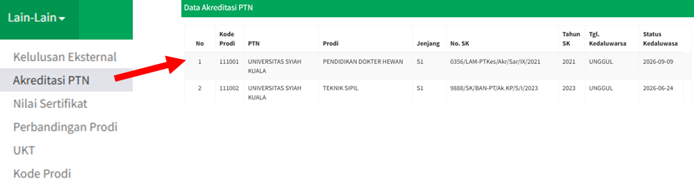 3. Scrolling ke bawah untuk melihat semua akreditasi PTN.