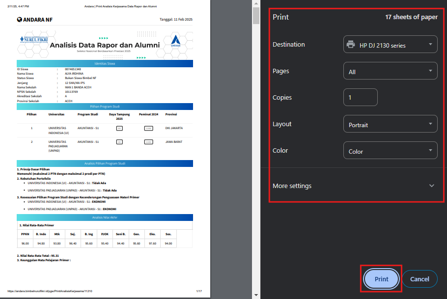 5. Lakukanlah konfigurasi print priview sesuai kebutuhan dan kalau sudah, anda dapat menekan tombol "Print".