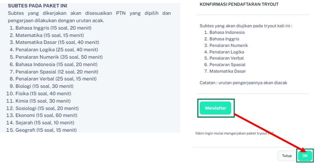Subtes yang dikerjakan akan disesuaikan PTN yang dipilih dan pengerjaan dilakukan dengan urutan acak dan tidak mengikuti urutan subtes yang sudah di list di sebelah kiri.
