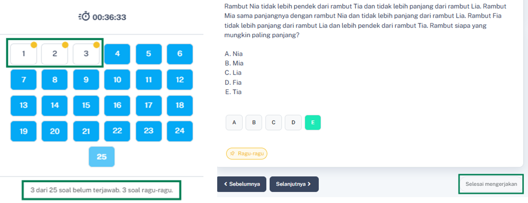 Ketika anda klik Ragu-Ragu pada soal, maka pada atas kanan soal akan diberi tanda kuning.