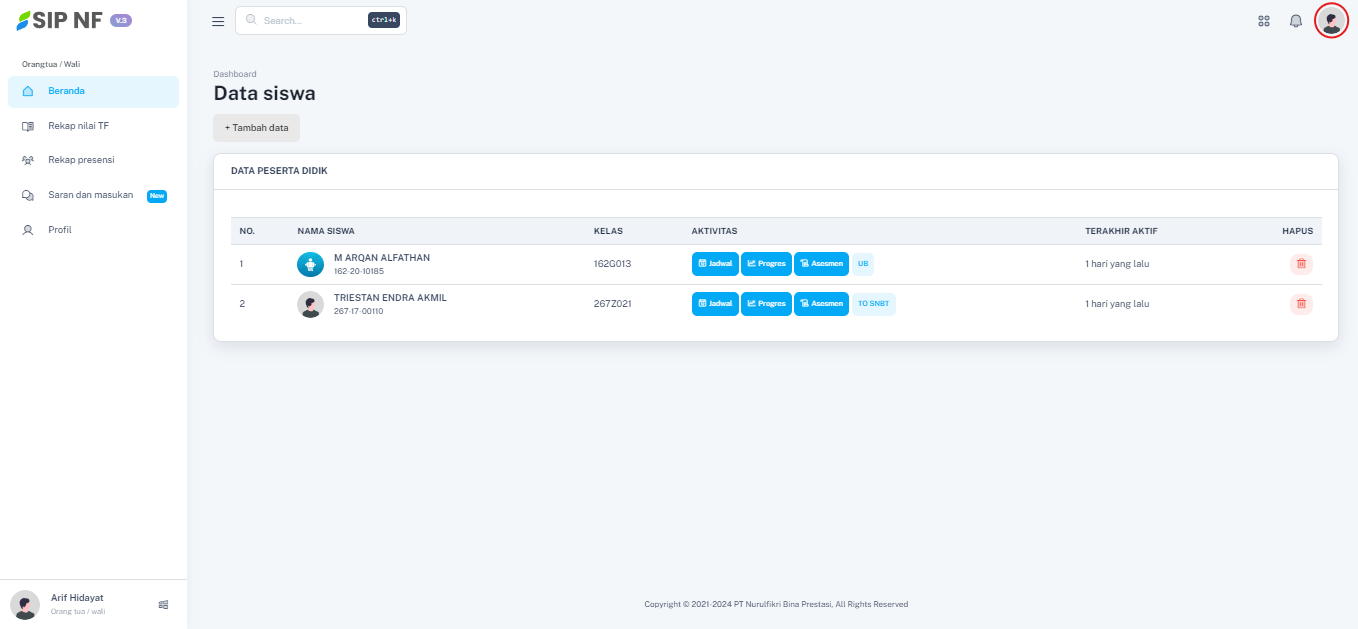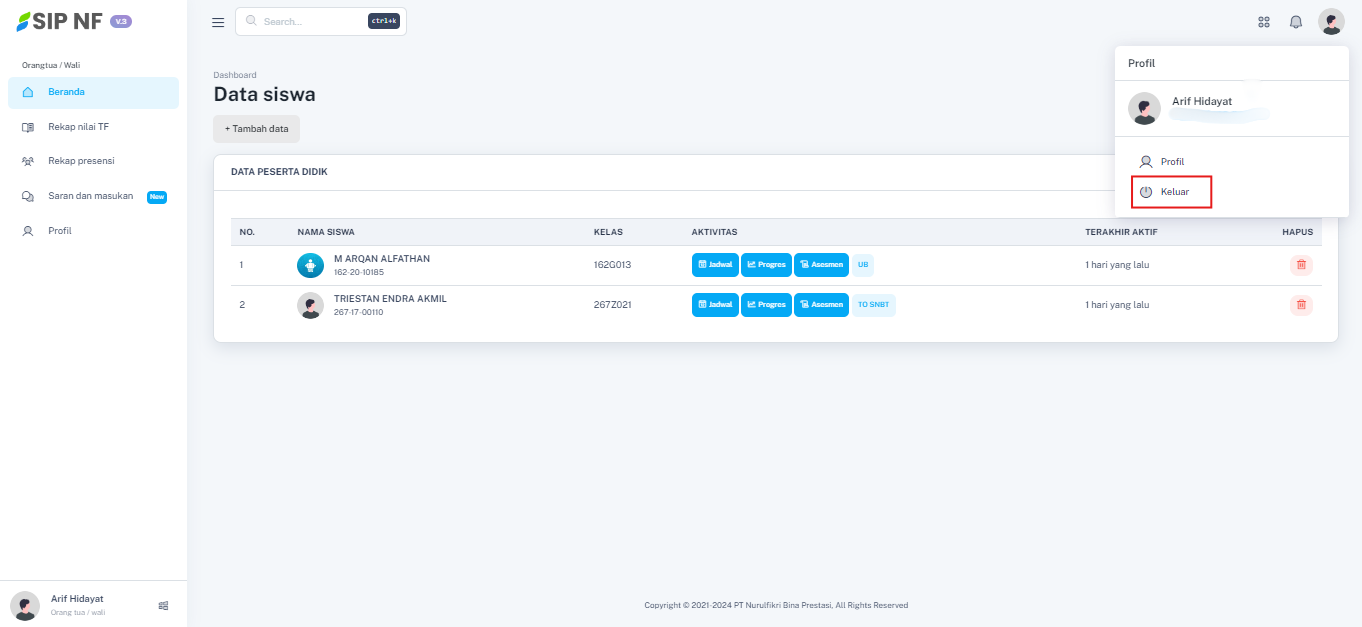 2. Pada dashboard, anda bisa menekan "FOTO PROFIL" seperti yang sudah ditunjukkan pada lingkaran merah di atas. Maka akan muncul tampilan dropdown profil seperti di bawah ini:
