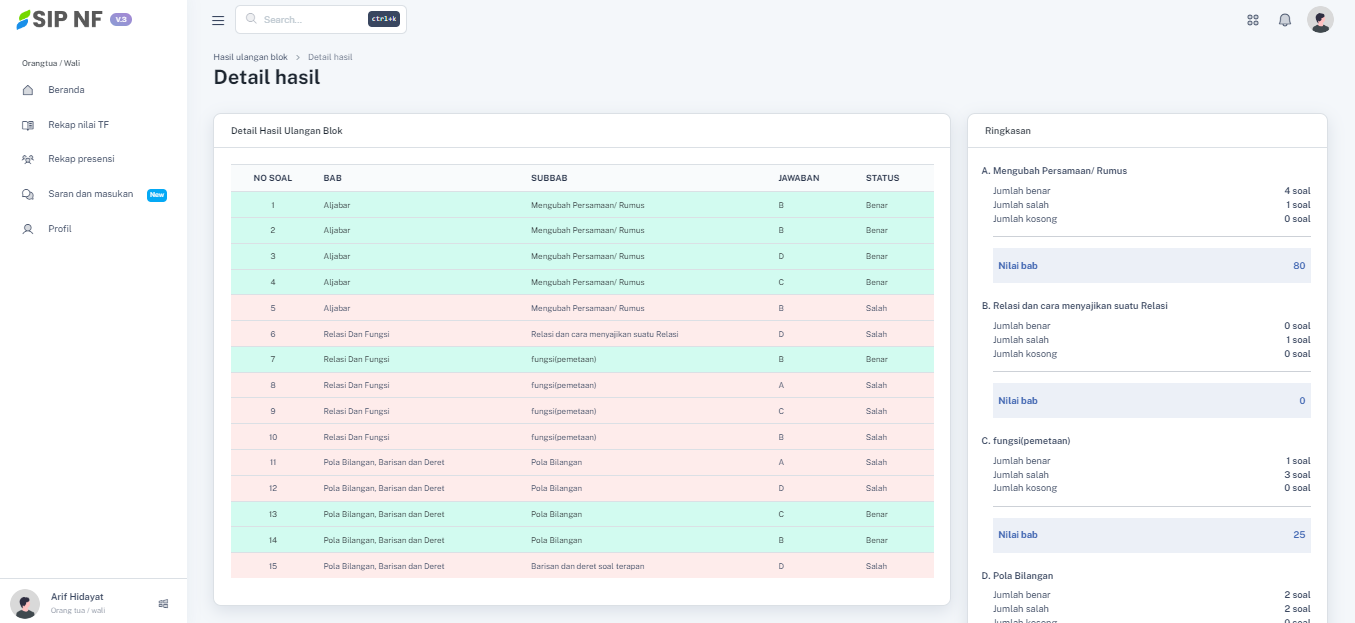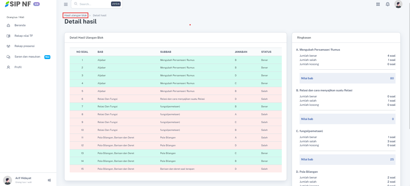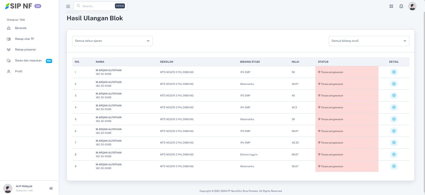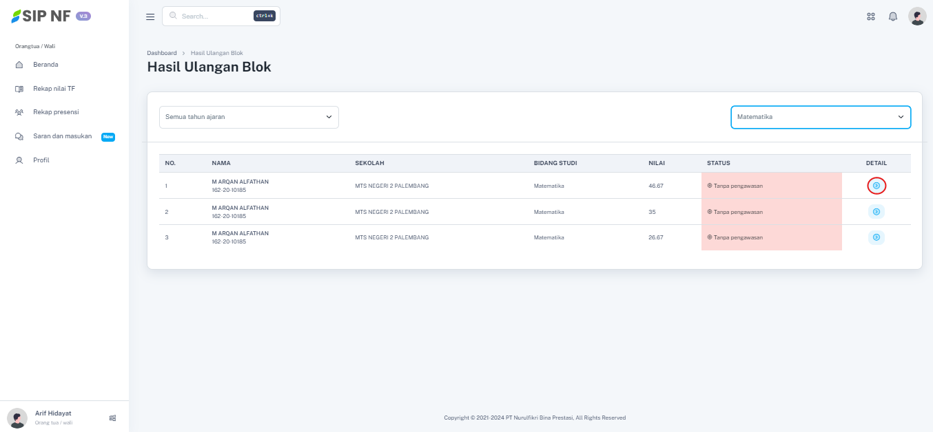 5. Maka akan muncul tampilan semua nilai matematika anak anda. Untuk melihat detail nilai, anda bisa menekan tombol yang sudah ditunjukkan pada lingkaran merah di bawah ini.