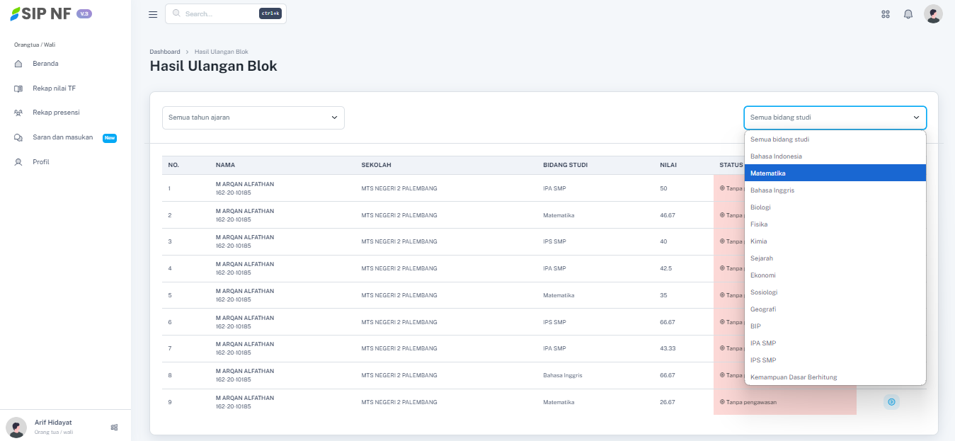 4. Untuk mempermudah pencarian nilai anak anda secara spesifik, kami menyediakan dropdown bidang studi. Misalnya, pada panduan kali ini, kita akan mencari nilai "MATEMATIKA". Anda dapat menekan tombol dropdown "SEMUA BIDANG STUDI >> MATEMATIKA".