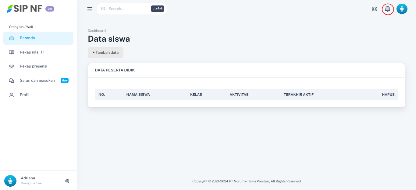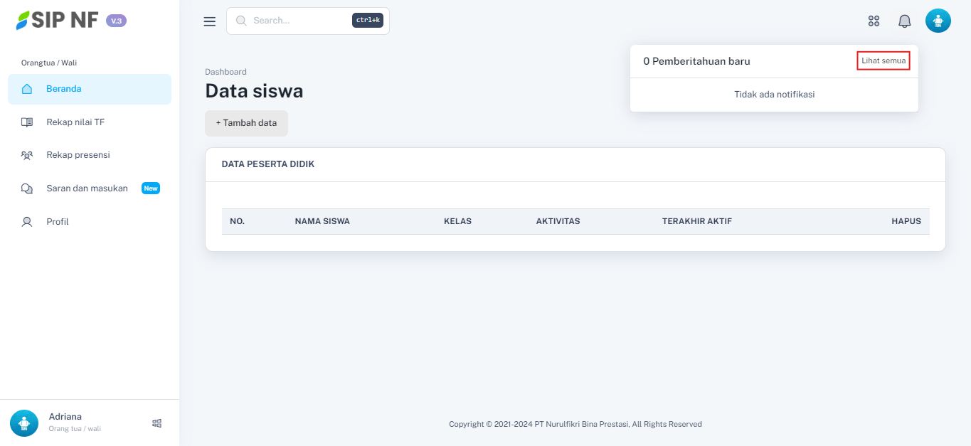 2. Pada dashboard, anda bisa menekan ikon "NOTIFIKASI" seperti yang sudah ditunjukkan pada lingkaran merah di atas. Maka akan muncul tampilan menu dropdown notifikasi seperti di bawah ini: