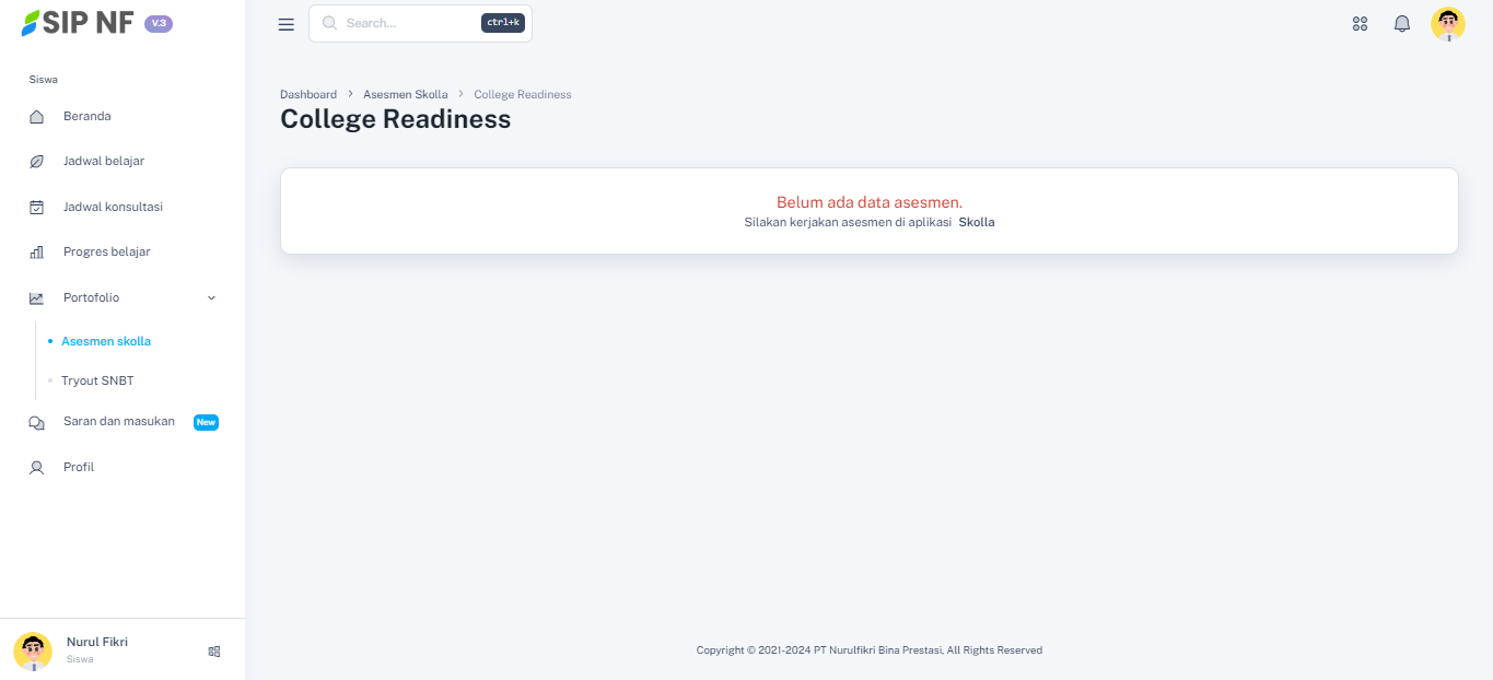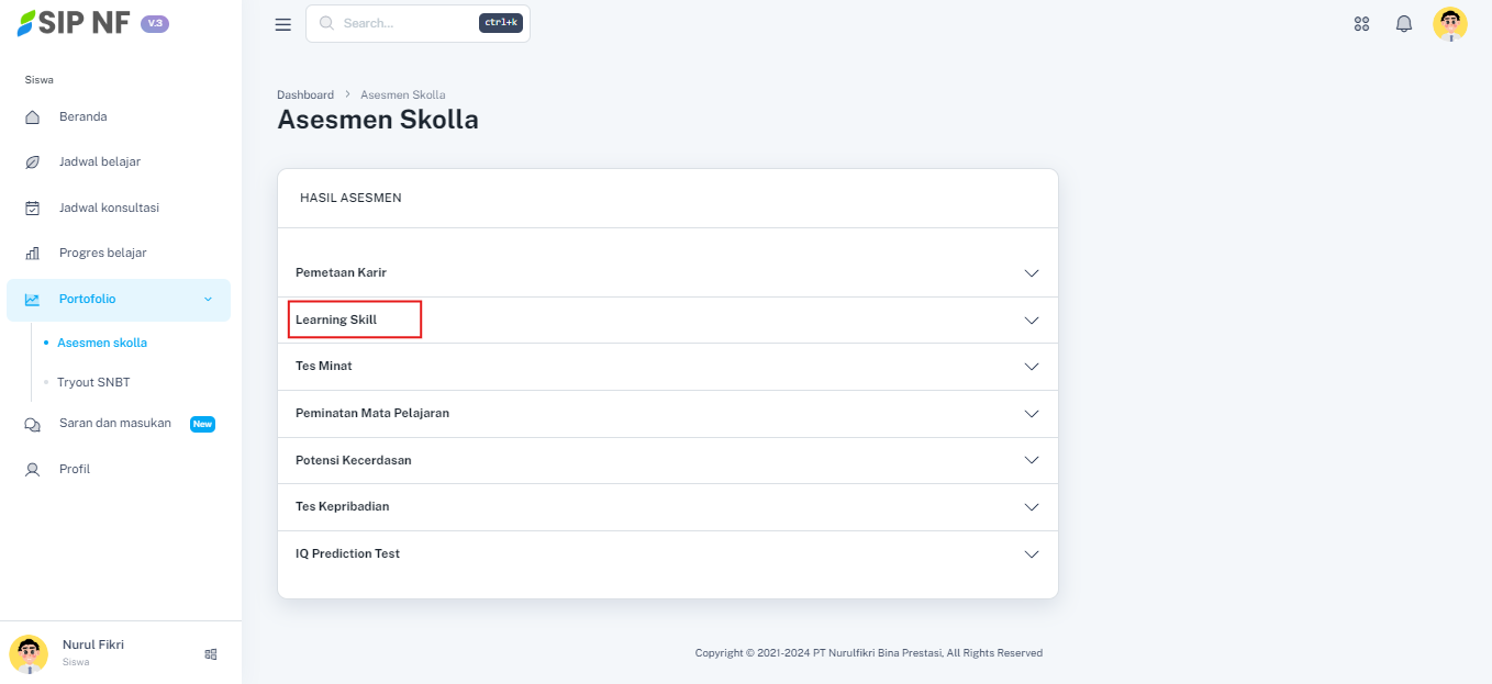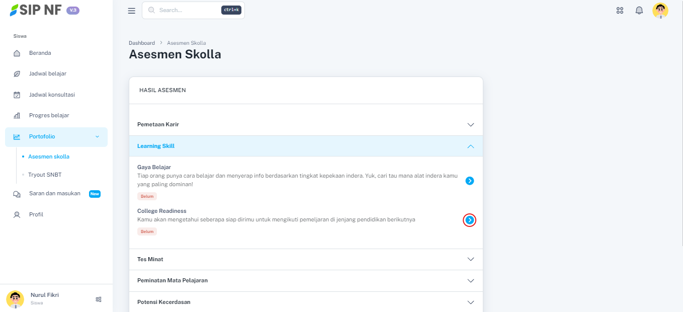 1. Mari kita mulai melihat hasil tes college readiness, masih dalam halaman portfolio, pilih dropdown "LEARNING SKILL".