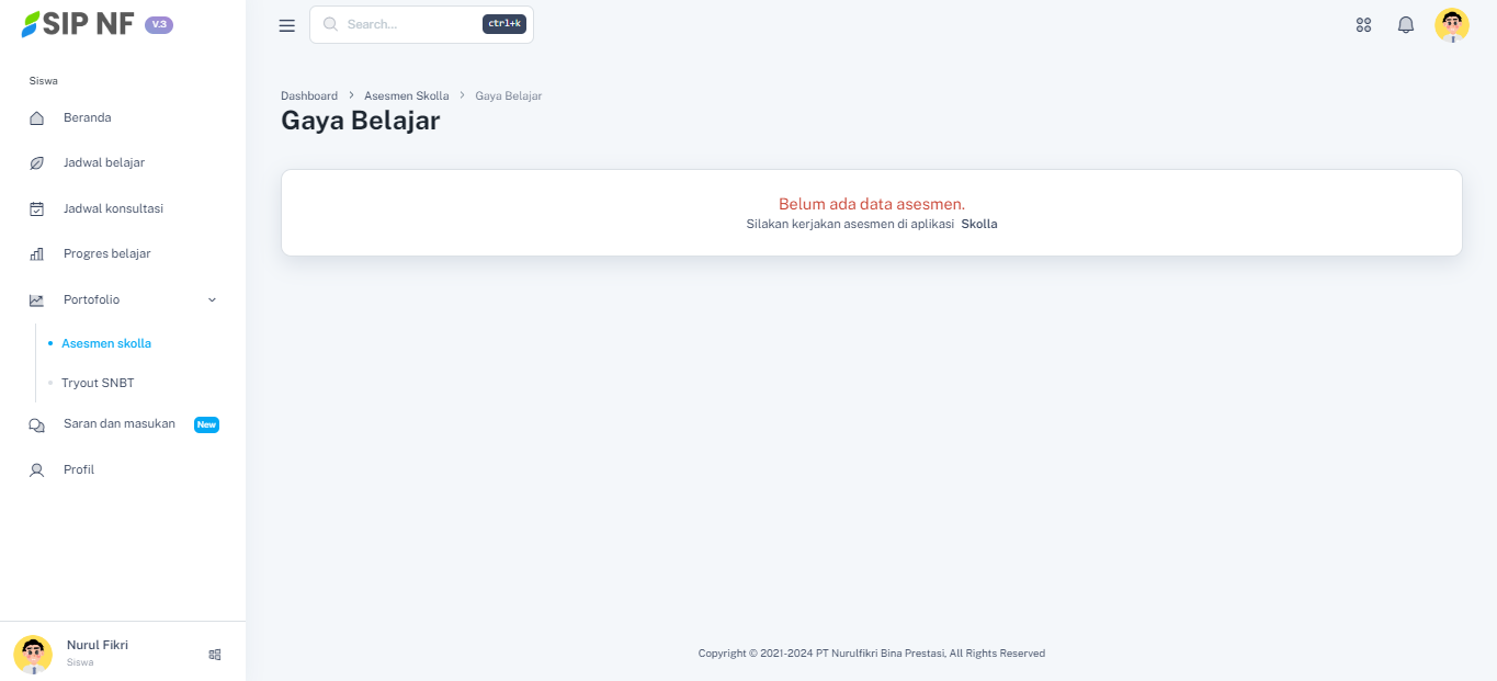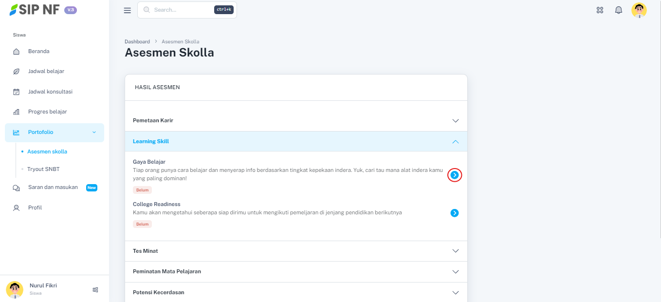 1. Mari kita mulai melihat hasil tes gaya belajar, masih dalam halaman portfolio, pilih dropdown "LEARNING SKILL".