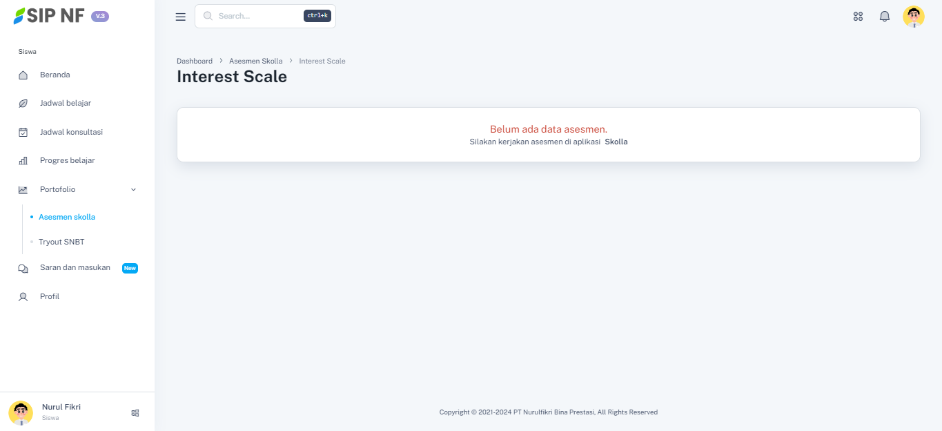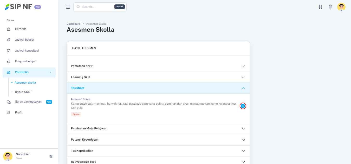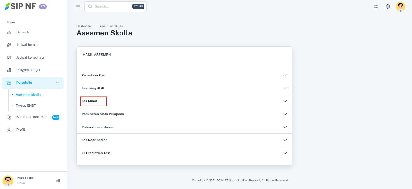 1. Mari kita mulai melihat hasil tes interest scale, masih dalam halaman portfolio, pilih dropdown "TES MINAT" untuk melihat hasilnya.