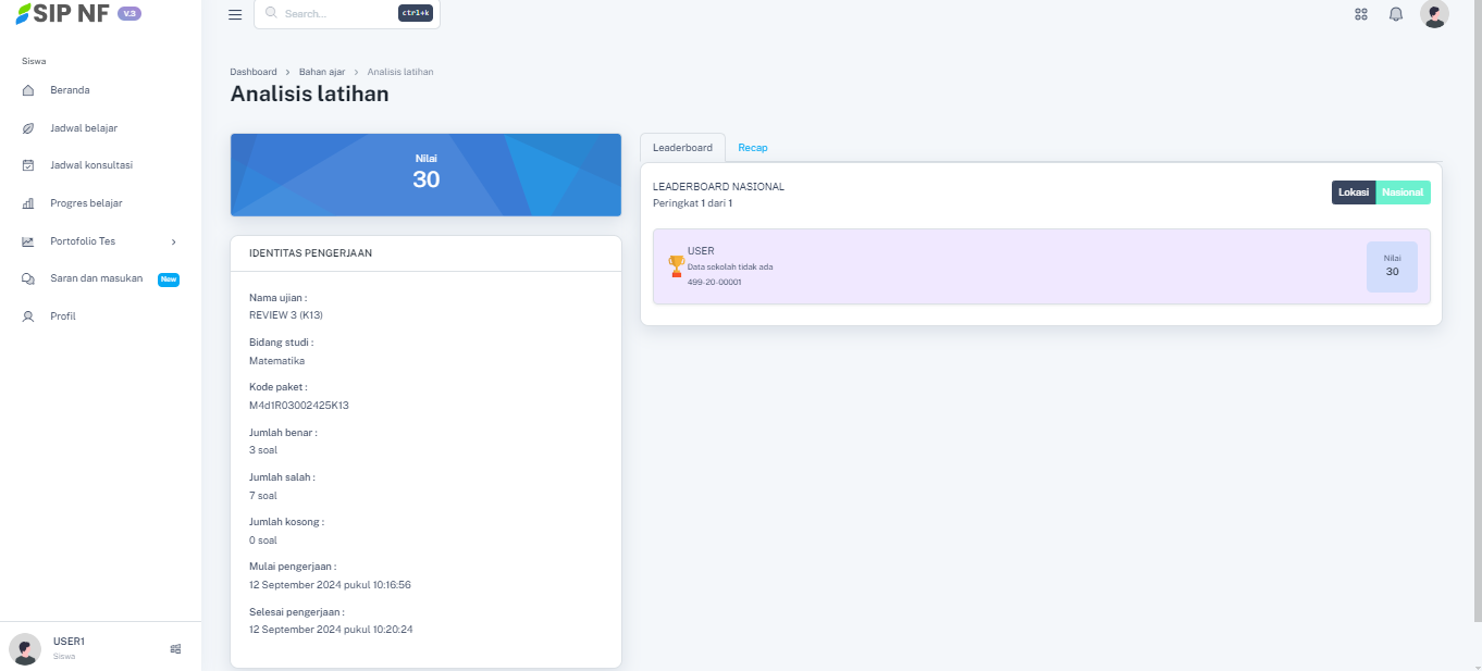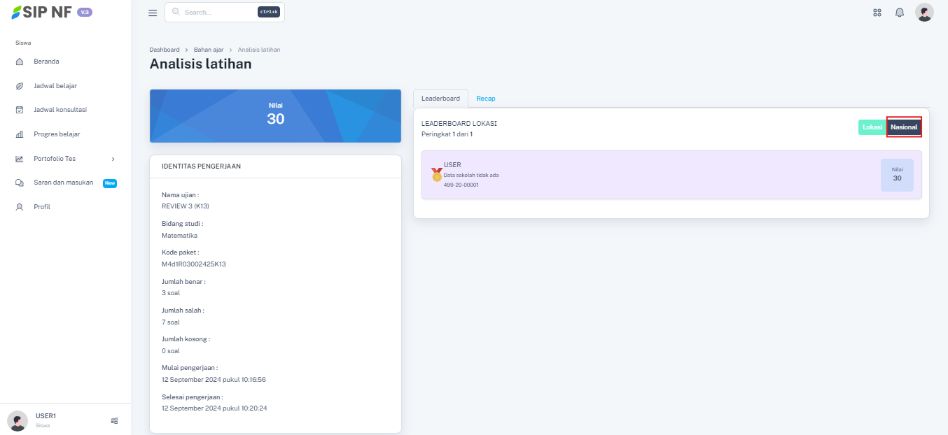 Leaderboard dibagi menjadi dua kategori. Kategori lokasi berlaku pemeringkatan siswa dengan nilai tertinggi berdasarkan lokasi Nurul Fikri tempat mereka belajar. Sedangkan kategori nasional berlaku pemeringkatan siswa dengan nilai tertinggi memiliki cakupan lebih luas, yaitu satu Indonesia. Pada tes review ini, bisa jadi kamu mendapatkan peringkat yang berbeda di paket lain karena sistem pemeringkatan pada tes ini adalah berdasarkan paket.