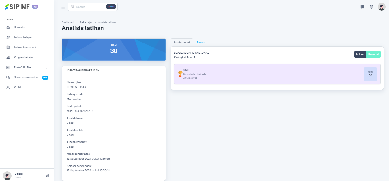 Leaderboard dibagi menjadi dua kategori. Kategori lokasi berlaku pemeringkatan siswa dengan nilai tertinggi berdasarkan lokasi Nurul Fikri tempat mereka belajar. Sedangkan kategori nasional berlaku pemeringkatan siswa dengan nilai tertinggi memiliki cakupan lebih luas, yaitu satu Indonesia. Pada tes review ini, bisa jadi kamu mendapatkan peringkat yang berbeda di paket lain karena sistem pemeringkatan pada tes ini adalah berdasarkan paket.