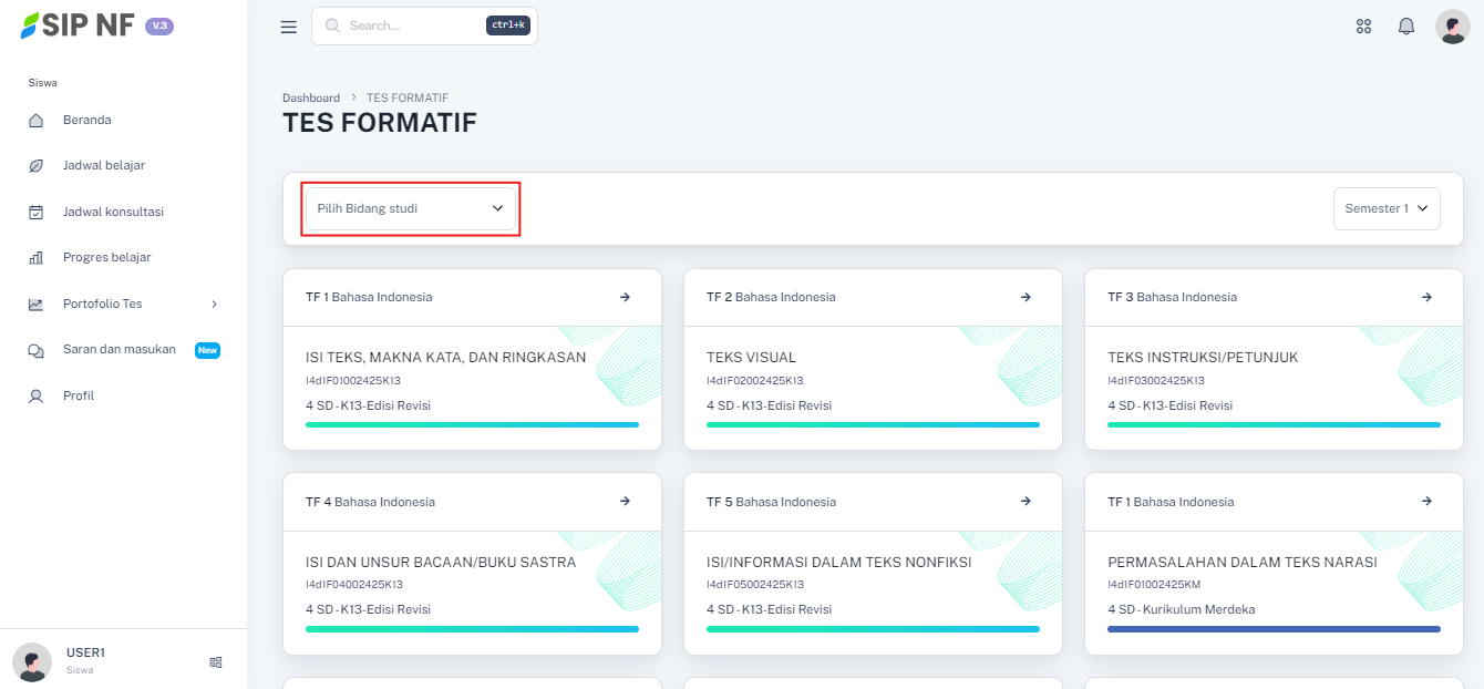 Pada halaman fitur tes formatif, tekan dropdown "PILIH BIDANG STUDI" atau kamu bisa tekan pada tombol yang sudah ditunjukkan pada persegi merah untuk mencari bidang studi. Lalu, pilih bidang studi "MATEMATIKA".