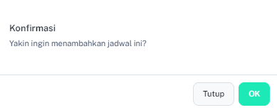 Perhatian! Akan muncul popup seperti di bawah ini yang menanyakan apakah kamu yakin ingin menambahkan jadwal atau tidak. Jika yakin, kamu bisa menekan tombol "OK" dan jika tidak kamu bisa menekan tombol "TUTUP".