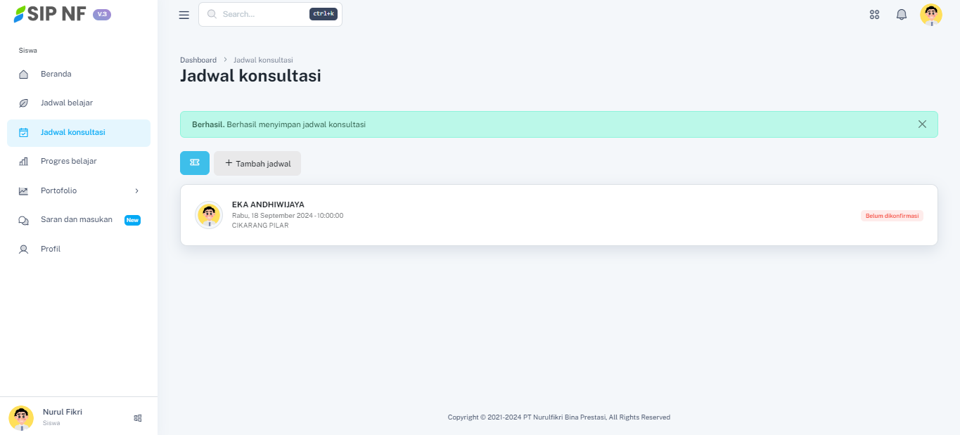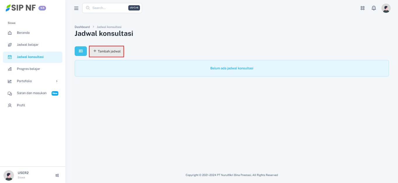 1. Masih pada halaman fitur jadwal konsultasi, kita akan mencoba untuk membuat janji temu dengan mentor. Pertama kamu dapat menekan tombol "TAMBAH JADWAL".