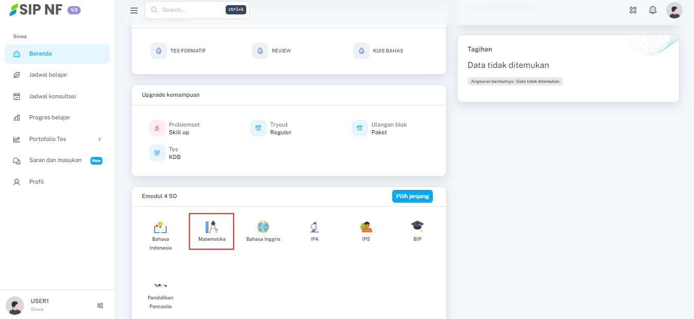 2. Pada panduan kali ini, kita akan mulai mengakses fitur e-modul yang berada di dashboard. Untuk panduan kali ini, kita akan memulainya dari modul "MATEMATIKA"