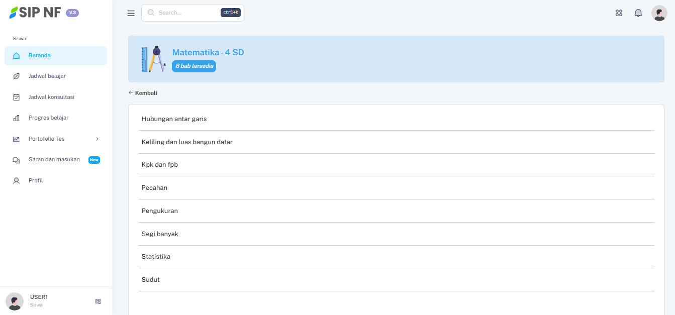 3.Pada bidang studi ini terdapat 8 sub bab yang dapat kamu akses pada LMS SIP ini yang bisa kamu pilih seperti tampilan layar di bawah ini.