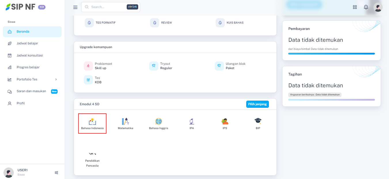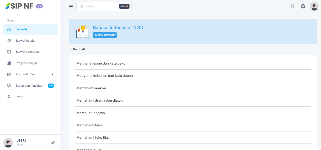 Untuk panduan kali ini, kita akan memulainya dari modul "BAHASA INDONESIA". Pada mata pelajaran ini terdapat 11 sub bab yang dapat kamu akses pada LMS SIP ini.image.png