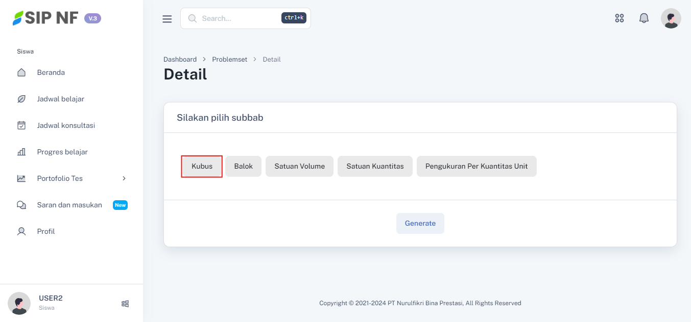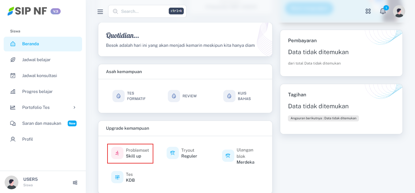 2. Pada panduan kali ini, kita akan mulai mengakses salah satu fitur pada menu upgrade kemampuan yang berada di dashboard. Kamu dapat menekan tombol "PROBLEMSET".