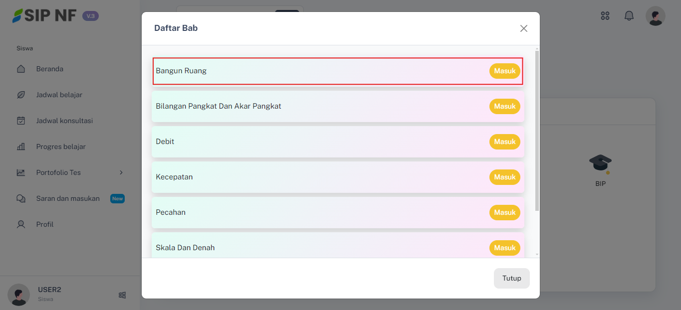 4. Setelah memilih mata pelajaran, maka tampilan layar akan menampilkan semua daftar bab yang terdapat di dalam e-modul mata kuliah. Sebagai contoh, pada panduan ini kita akan memilih bab "BANGUN RUANG" pada mata pelajaran Matematika. Pada kolom bangun ruang, tekan tombol "MASUK" seperti contoh di bawah ini.
