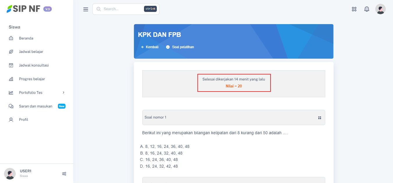 6. Jika sudah terkirim, maka akan muncul tampilan layar seperti di bawah yang menunjukkan skor akhir siswa saat mengerjakan soal pelatihan beserta waktu selesai mengerjakannya.