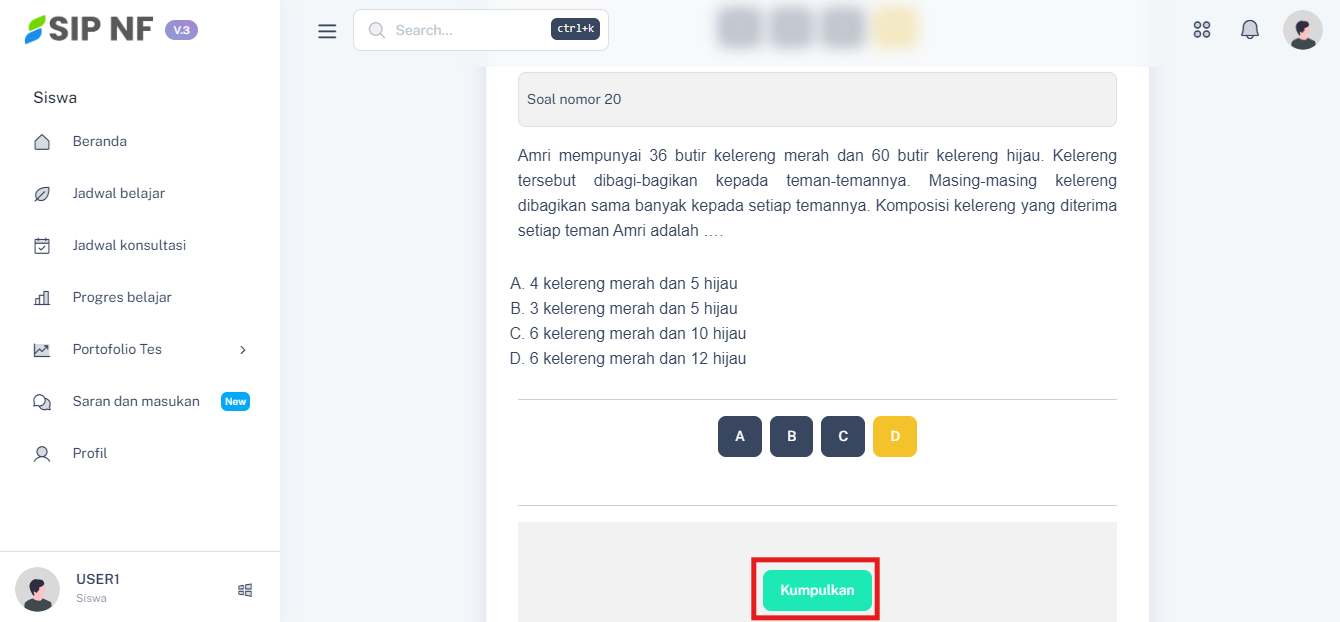 5. Cobalah untuk menjawab pertanyaan tersebut sampai nomor terakhir agar kamu bisa melihat skor, jawaban yang benar, dan pembahasan materi dari soal yang telah diberikan. Jika sudah, kamu dapat menekan tombol "KUMPULKAN".