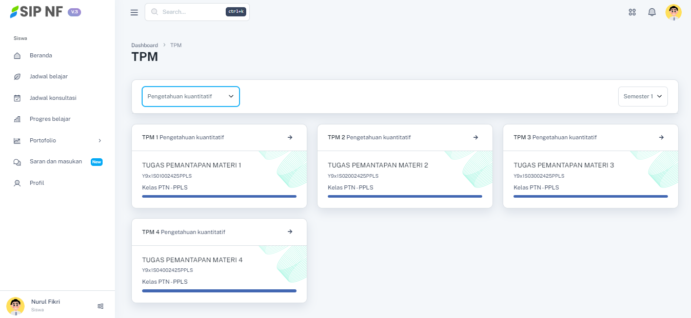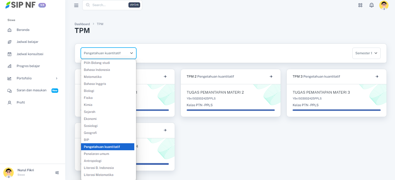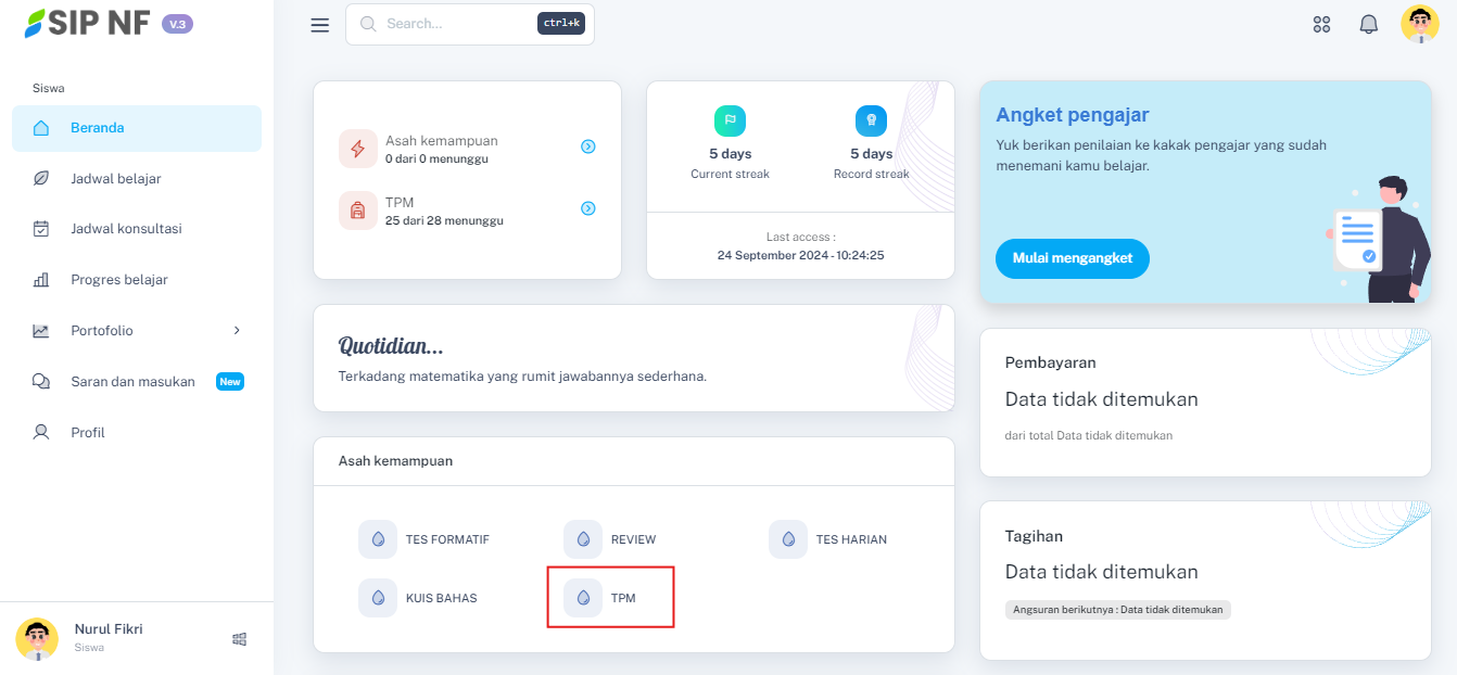 2. Pada panduan kali ini, kita akan mulai mengakses fitur tes pemantapan materi yang berada di dashboard. Kamu dapat menekan tombol "TPM".