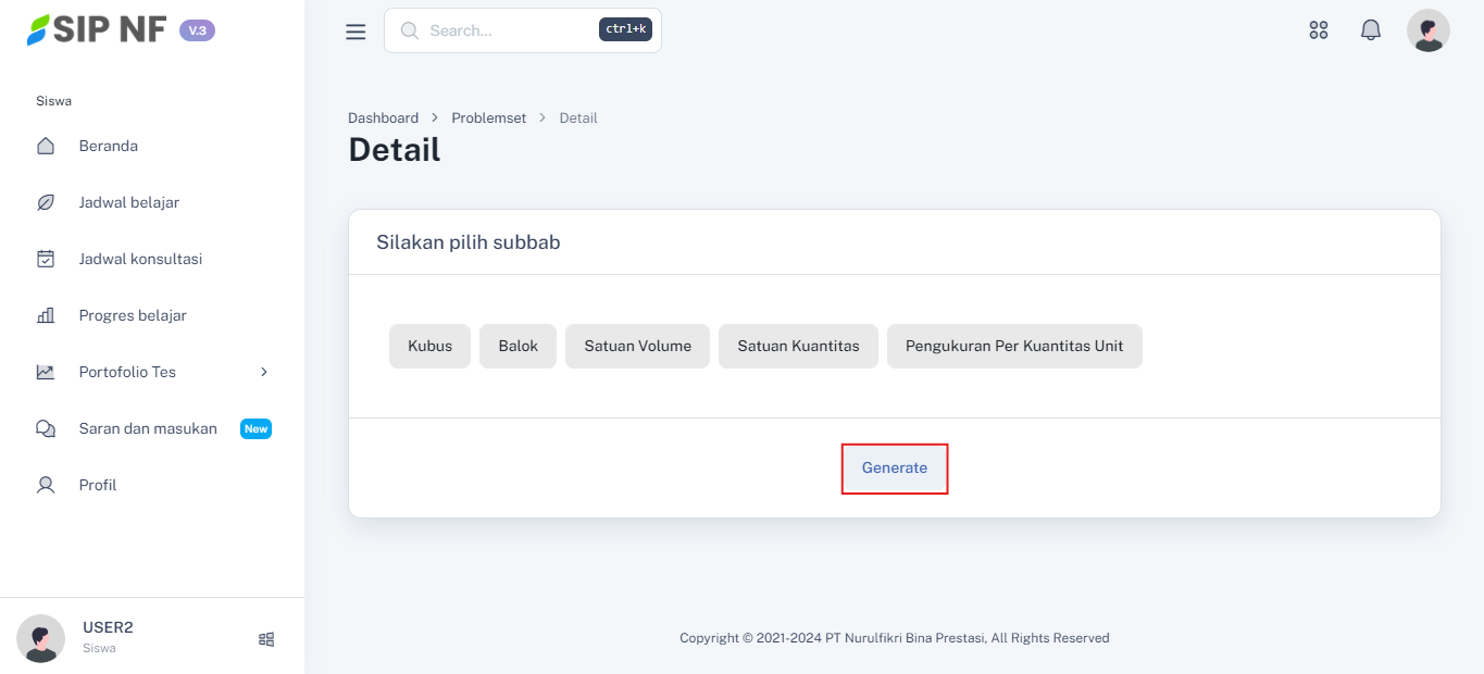 1. Masih pada halaman fitur problemset, kita akan mencoba untuk menjawab semua soal yang ada. Setelah memilih sub bab, kamu harus menekan tombol "GENERATE" untuk mulai mengerjakan soal.