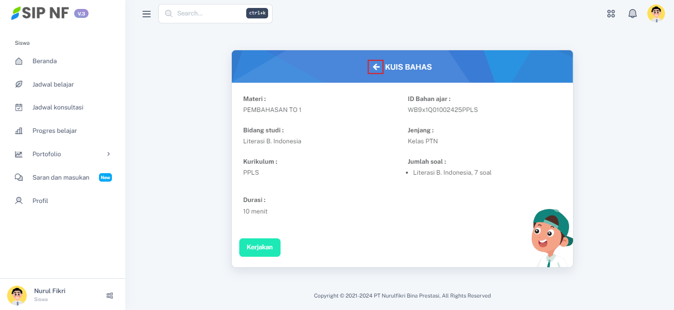 2. Berikut adalah tampilan layar dari fitur kuis bahas yang berisi card informasi mengenai detail tes sebelum diujikan. Jika sudah selesai membaca detailnya, kamu bisa tekan tombol "KERJAKAN" untuk menuju halaman lembar soal atau tekan tombol yang sudah ditunjukkan pada kotak merah di bawah ini untuk kembali halaman utama kuis bahas.