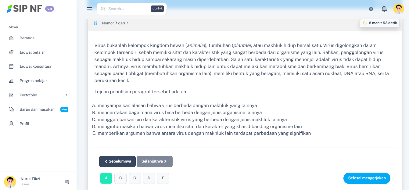 4. Berikut adalah tampilan layar halaman lembar soal dari kuis bahas. Kamu bisa memilih jawaban yang menurutmu benar dengan menekan salah satu opsi huruf yang tersedia seperti contoh di bawah ini. Setelah memilih jawaban, kamu bisa lanjut ke soal berikutnya dengan menekan tombol "SELANJUTNYA".
