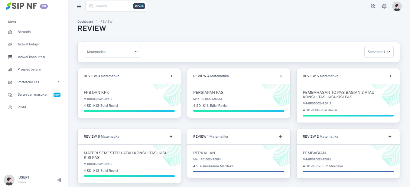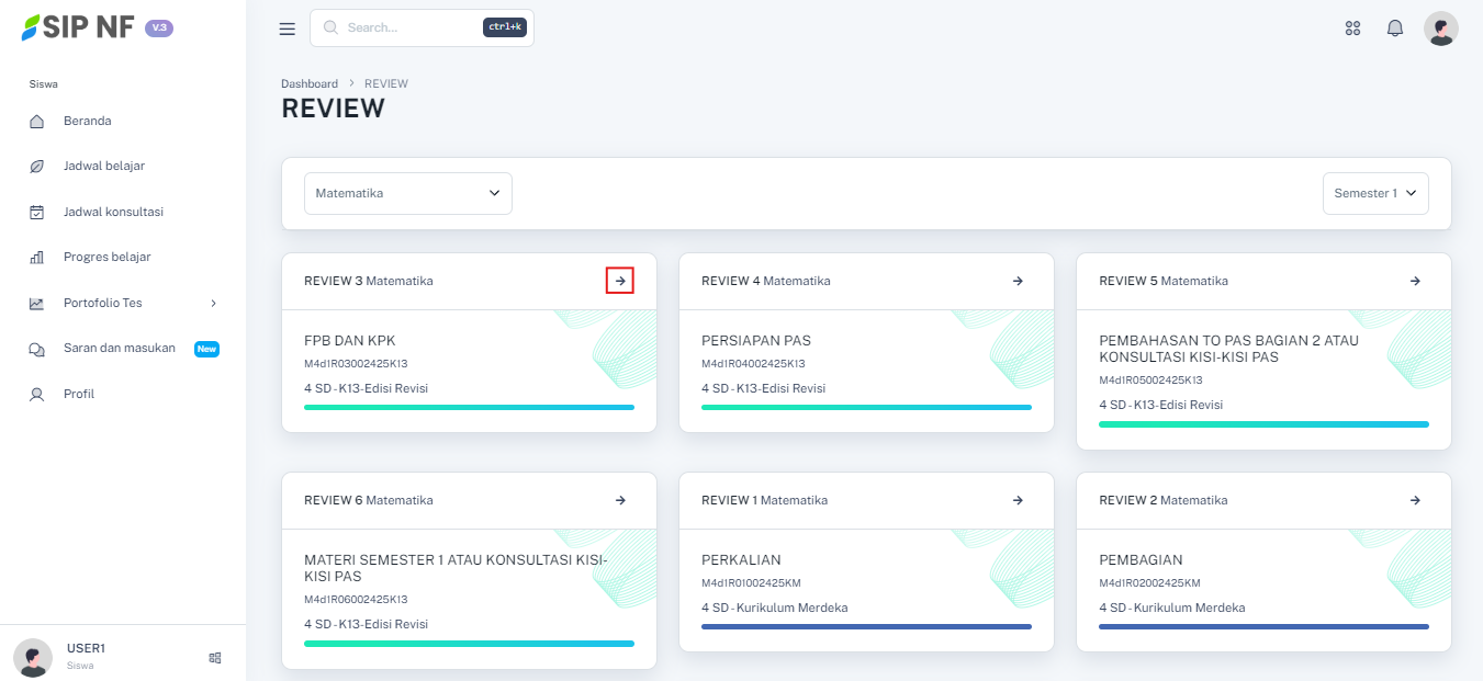 2. Mari kita mulai untuk mengerjakan soal. Pada halaman tes review, pilih card "REVIEW 3 MATEMATIKA".
