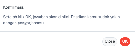 Perhatian! Akan muncul popup seperti di bawah ini yang menanyakan apakah kamu yakin ingin mengirimkan jawaban atau tidak. Jika yakin, kamu bisa menekan tombol "OK" dan jika tidak kamu bisa menekan tombol "CLOSE".