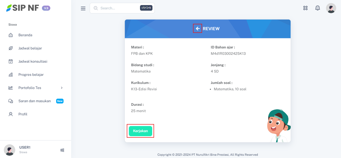 3. Berikut adalah tampilan layar dari fitur tes review yang berisi card informasi mengenai detail tes sebelum diujikan. Jika sudah selesai membaca detailnya, kamu bisa tekan tombol "KERJAKAN".