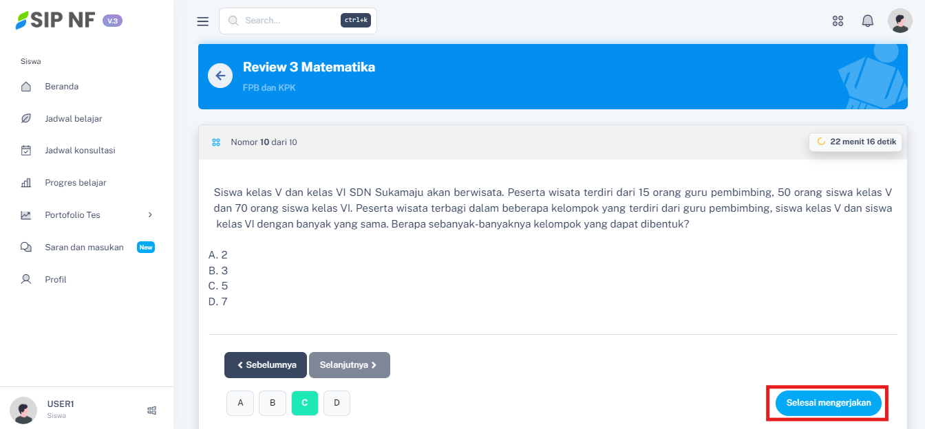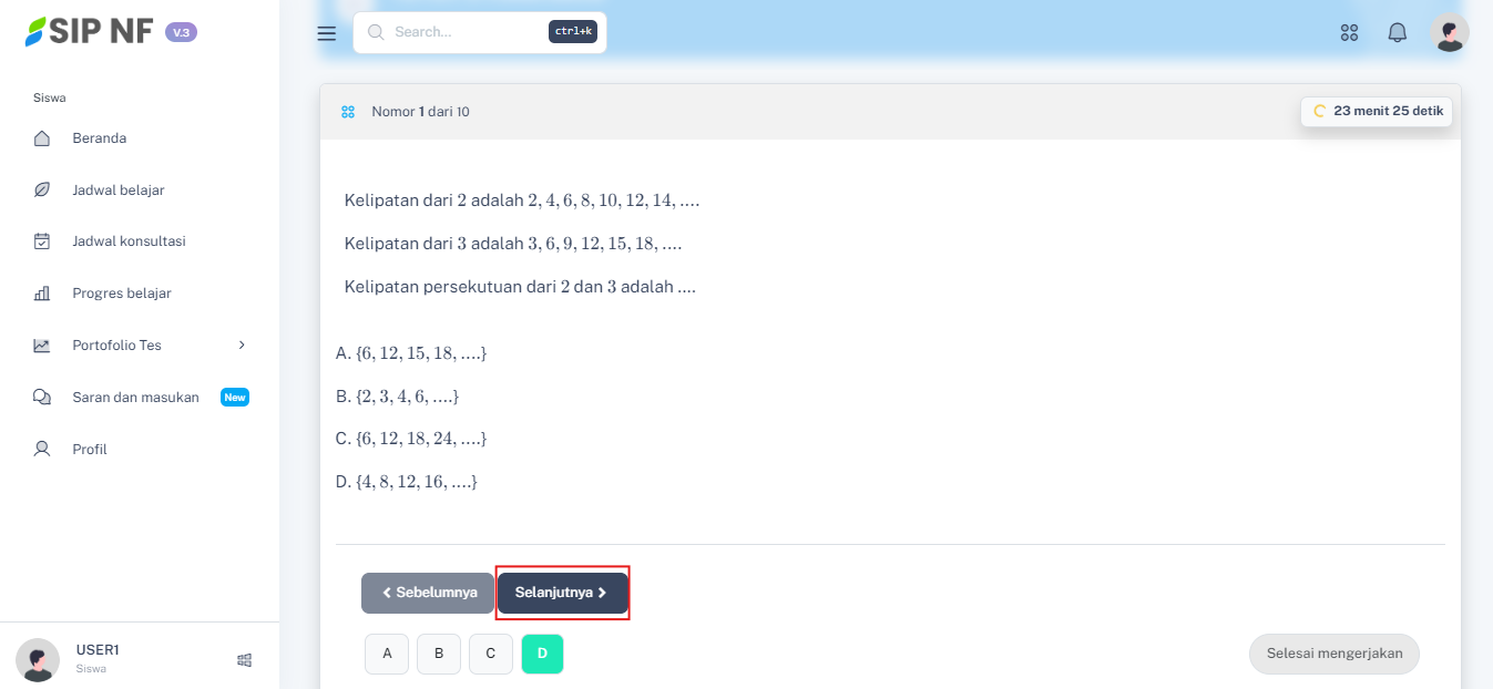 4. Setelah menjawab pop up tersebut kamu akan diarahkan ke halaman pengerjaan soal. Sama seperti tes formatif, kamu diminta untuk menjawab seluruh pertanyaan dengan menekan tombol jawaban yang tertera di bawah soal. Jika sudah, kamu bisa tekan tombol "SELANJUTNYA" untuk menjawab soal berikutnya.